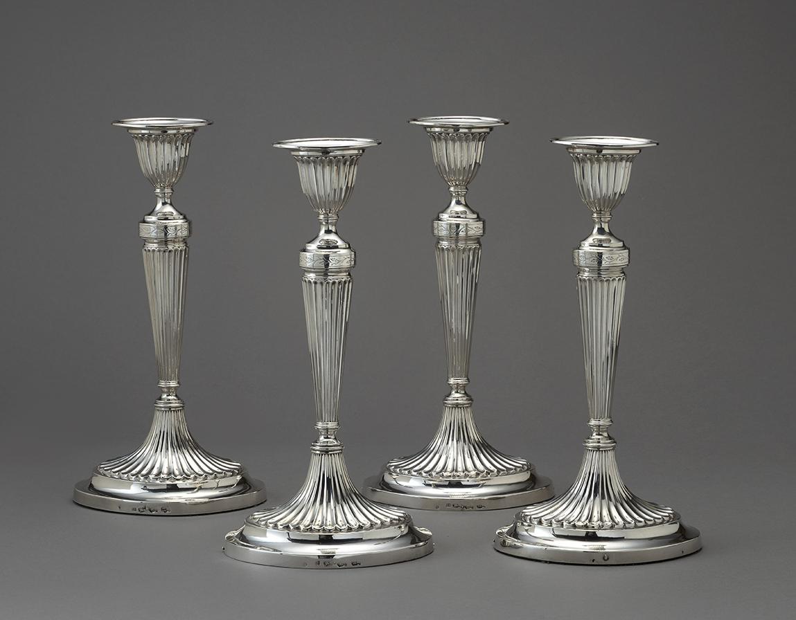 An elegant set of four silver candlesticks by Johannes van der Toorn I, The Hague. Each piece stands on a circular base with gadrooned decoration rising into a fluted stem of tapering form, crowned by a vase-shaped sconce with matching fluting.